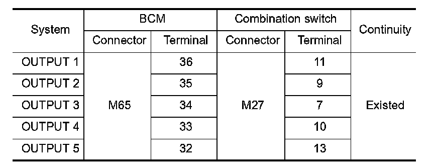 3. Check continuity between BCM harness connector and combination switch harness connector.