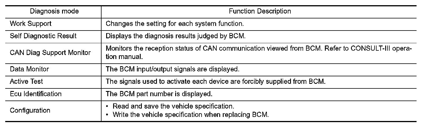 CONSULT-III performs the following functions via CAN communication with BCM.