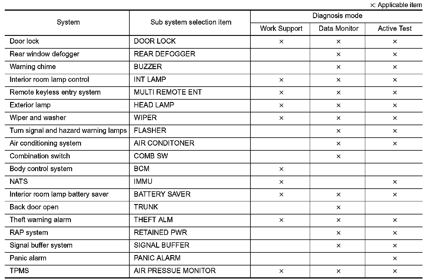 It can perform the diagnosis modes except the following for all sub system selection items.