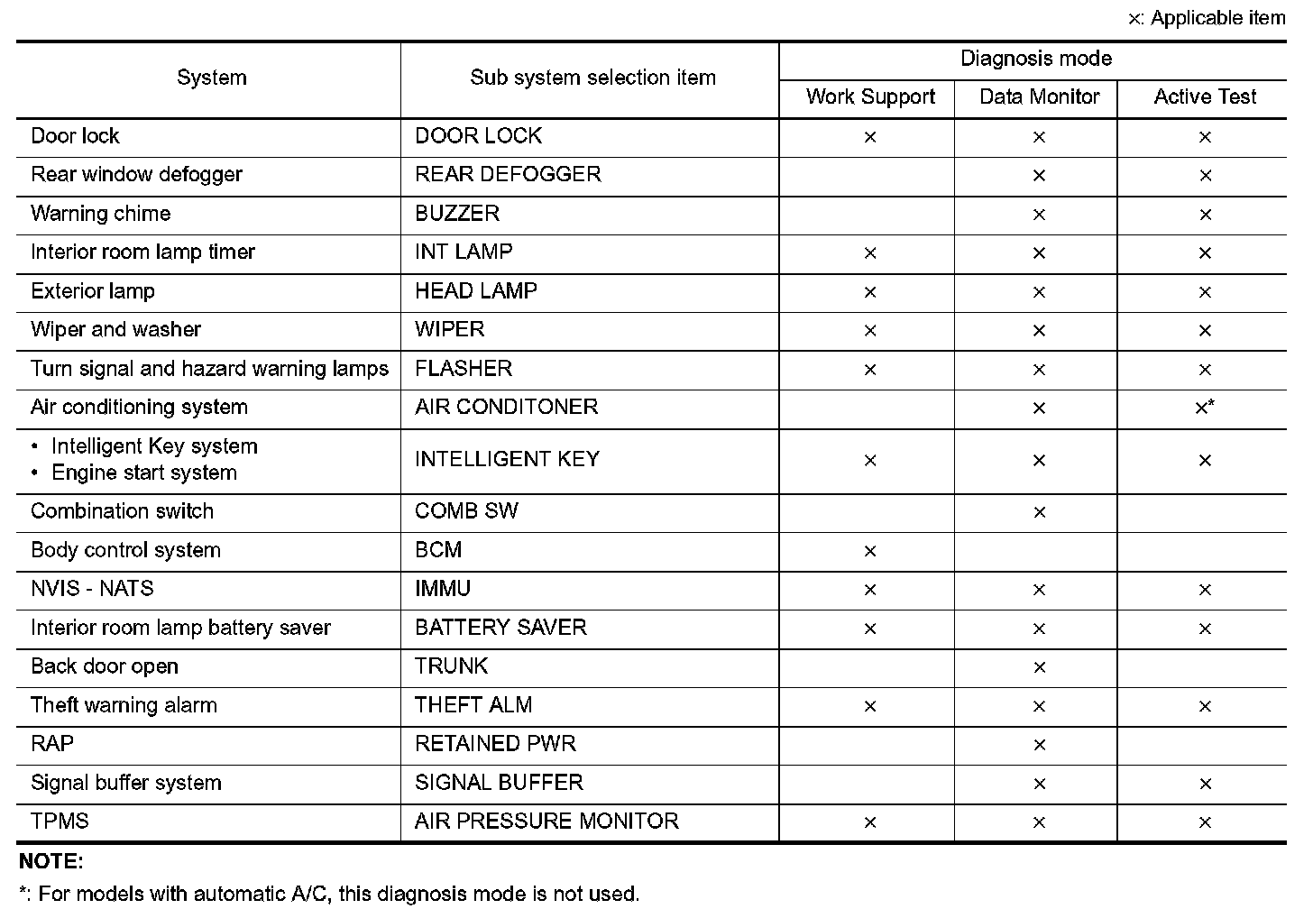 It can perform the diagnosis modes except the following for all sub system selection items.