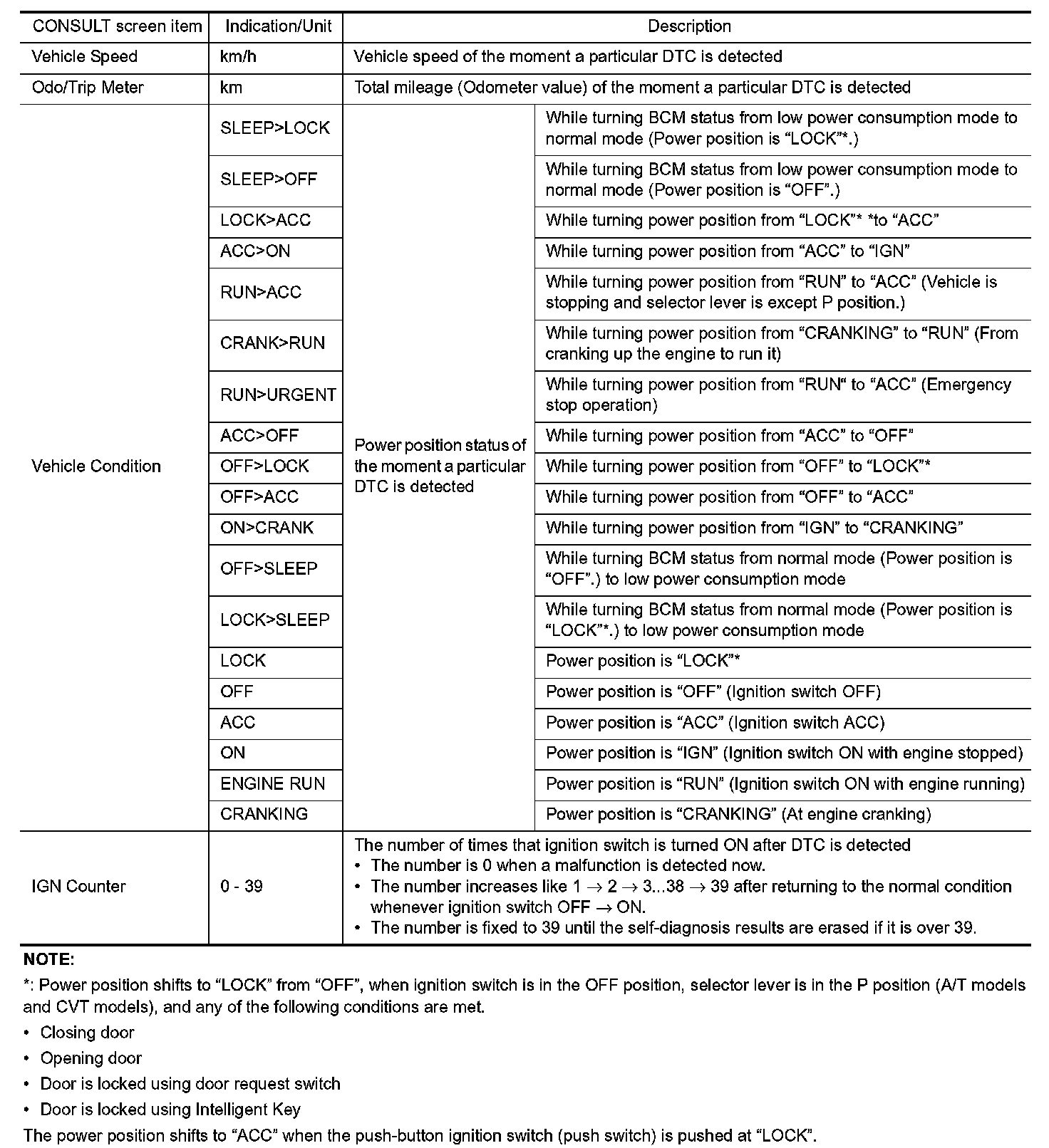 The BCM records the following vehicle condition at the time a particular DTC is detected, and displays on