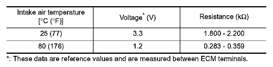 The intake air temperature sensor 1 is built-into mass air flow sensor. The sensor detects intake air temperature and transmits a signal to the ECM.