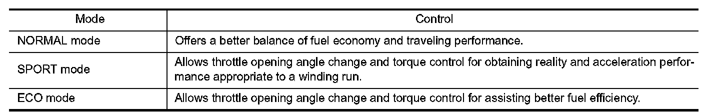 ECM controls torque and throttle opening angle characteristics appropriate for each mode, based on a NORMAL mode signal, SPORT mode signal, or ECO mode signal received from the multi display unit via CAN communication.