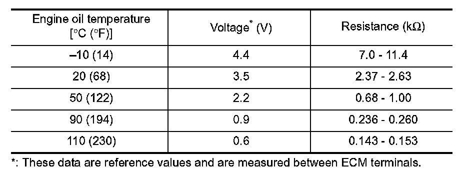 The engine oil temperature sensor is used to detect the engine oil temperature. The sensor modifies a voltage signal from the ECM.