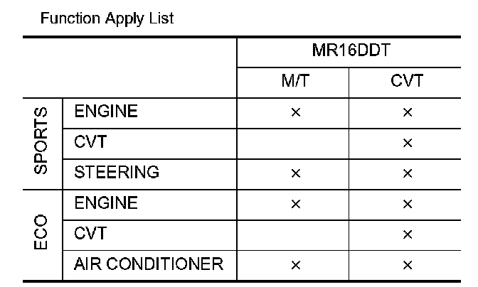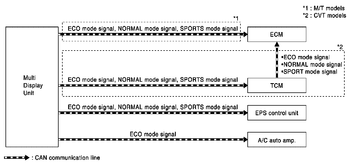 - Based on the mode signals received from TCM (CVT models) or multi display unit (M/T models) via CAN communication, ECM changes over the throttle position and other characteristics.