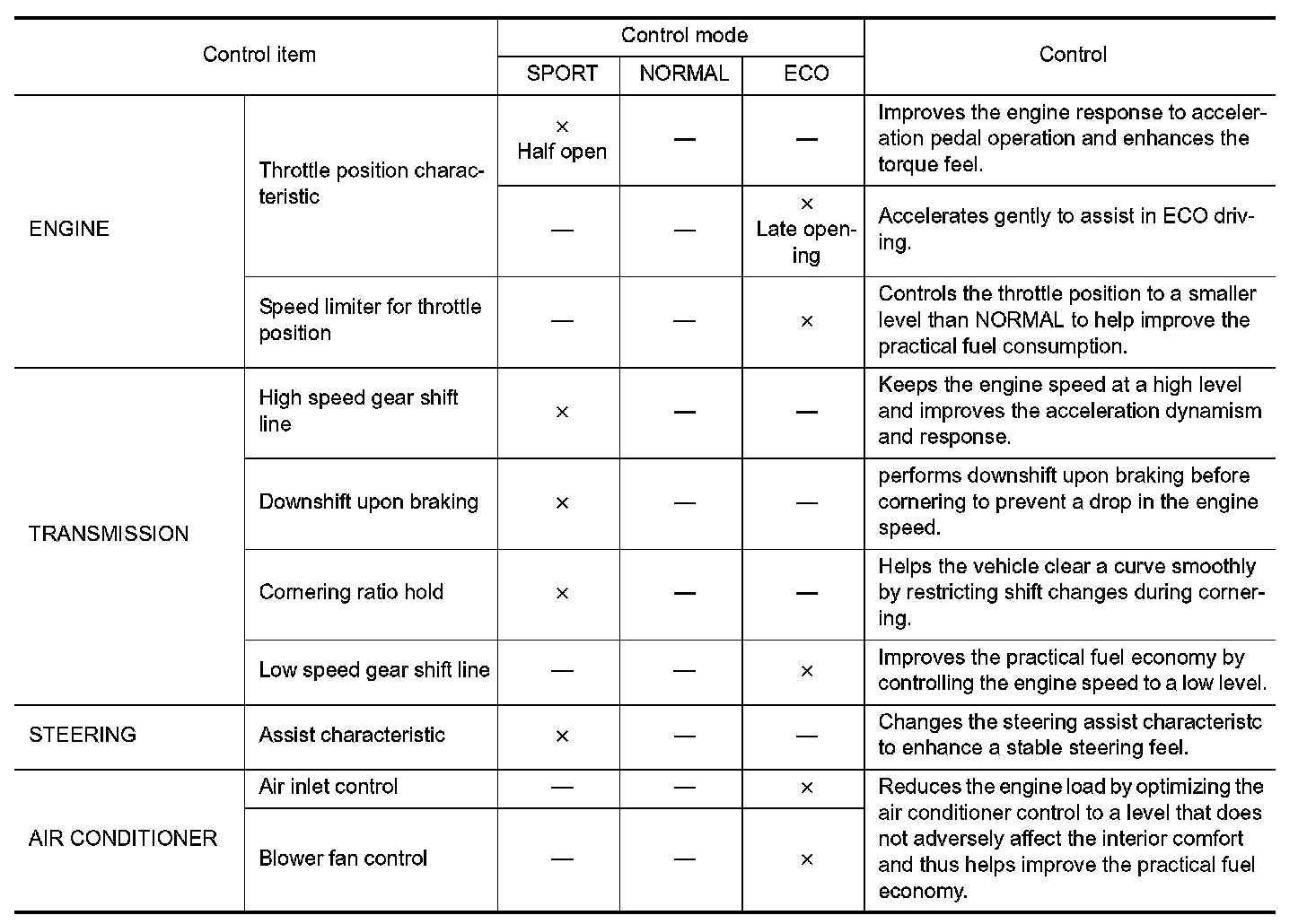 - With the NORMAL mode as the base mode, the control of vehicle characteristics is changed over to the following modes.