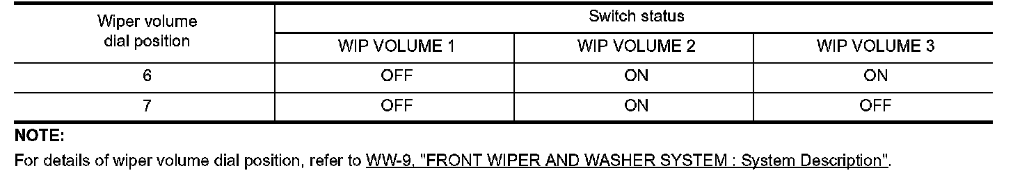 BCM judges the wiper volume dial 1 - 7 by the status of WIP VOLUME 1, 2 and 3 switches.