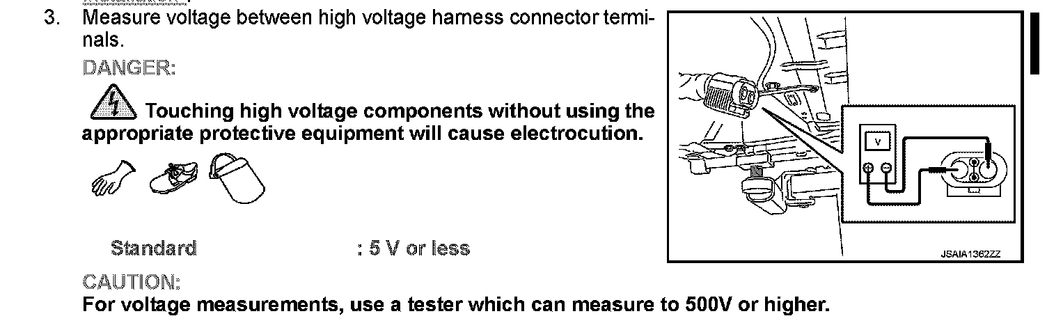 3.Measure voltage between high voltage harness connector terminals.