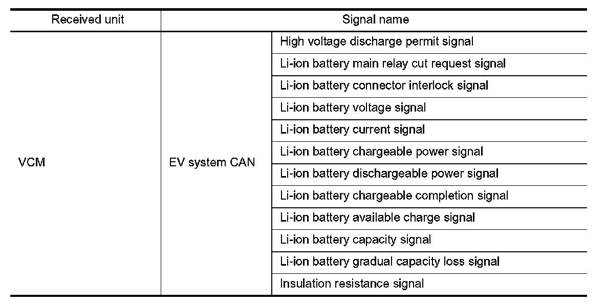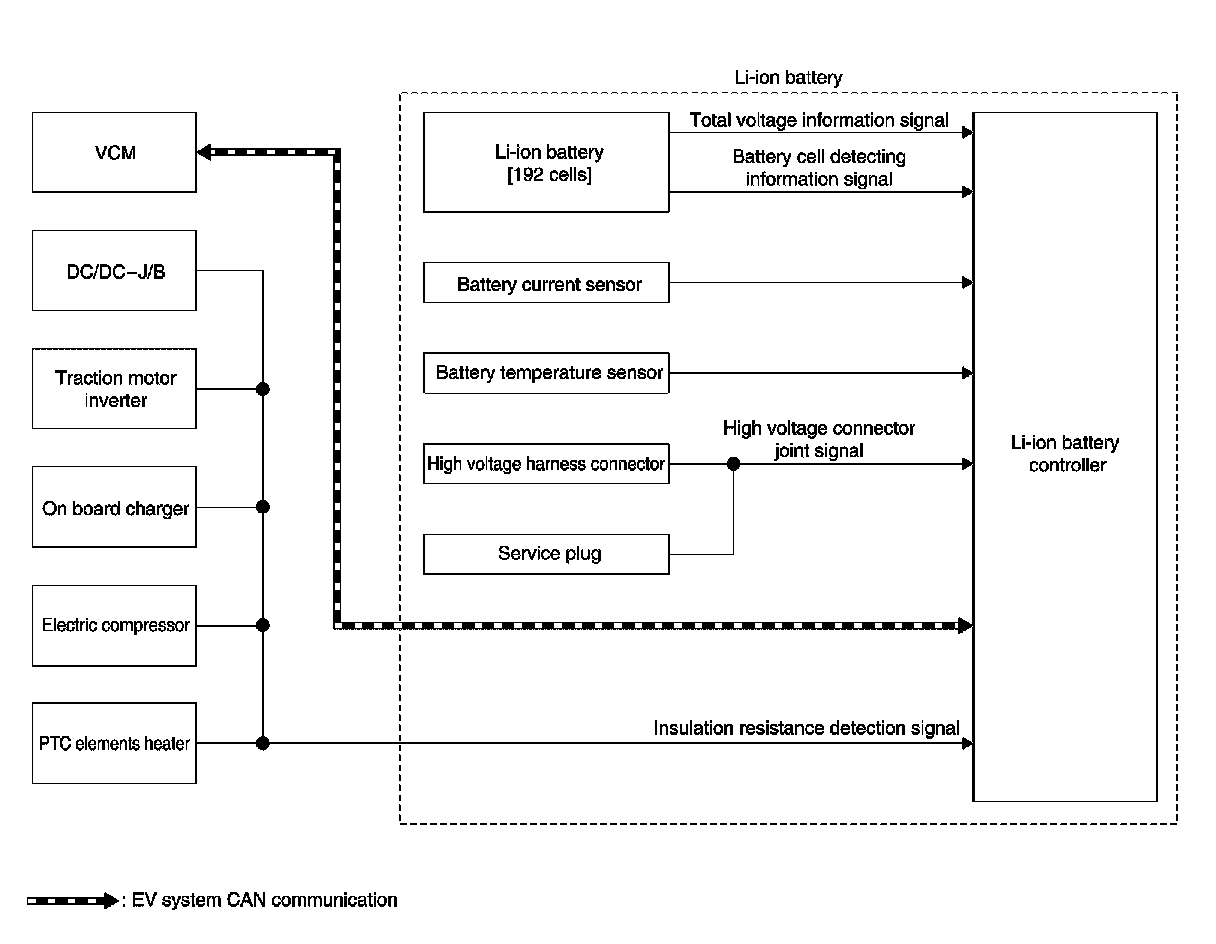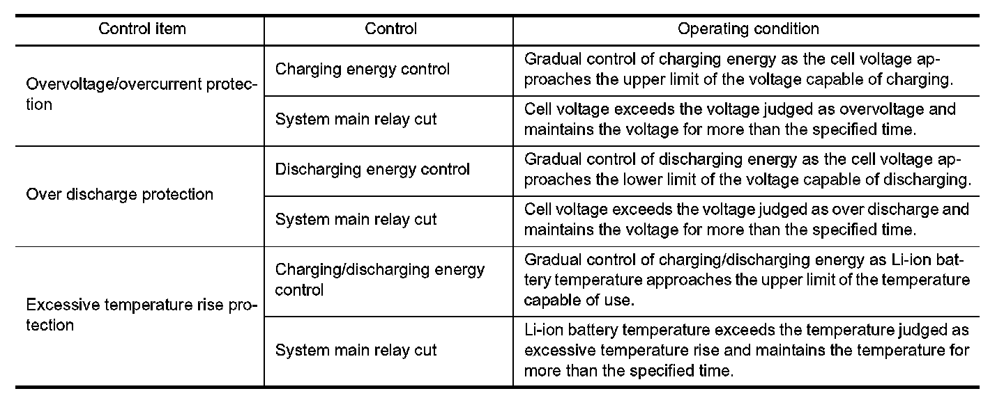 The Li-ion battery controller (LBC) monitors the status of the inside of the Li-ion battery at all times and sends information, such as the charging status of Li-ion battery and possible power, to VCM (vehicle control module)