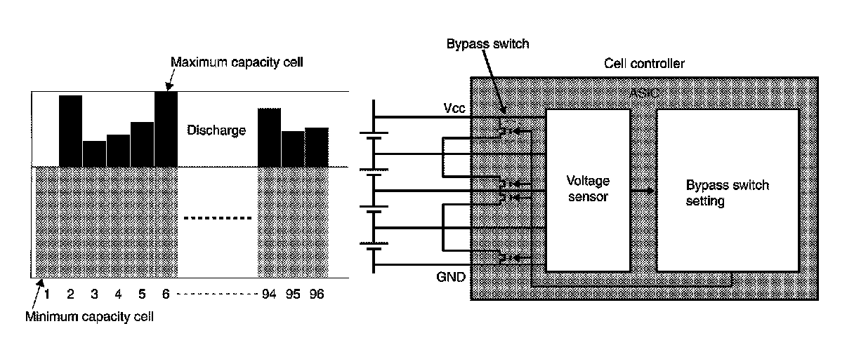 During cell capacity adjustment, the capacity of each cell is estimated based on the no-load voltage when the system starts, and the capacities are adjusted so that they are all at the target level. The voltage of each cell is detected inside the Li-ion battery controller. The bypass switches are then turned ON to discharge the cells that have excess capacity. In this way, capacity adjustment by the Li-ion battery controller allows the capacity of all cells to be fully utilized.