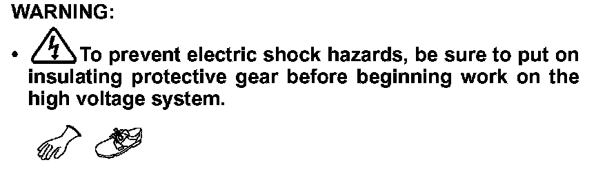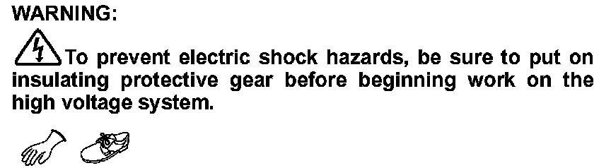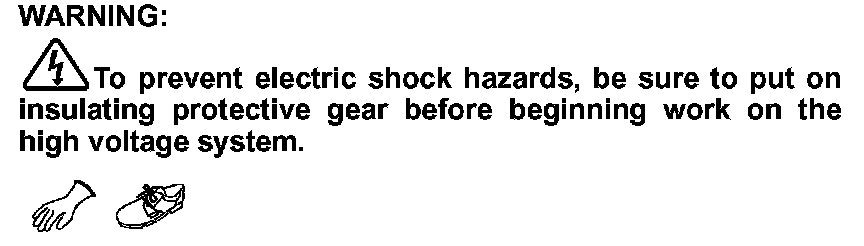 - Be sure to wear insulating protective equipment consisting of glove, shoes, face shield and glasses before beginning work on the high voltage system.