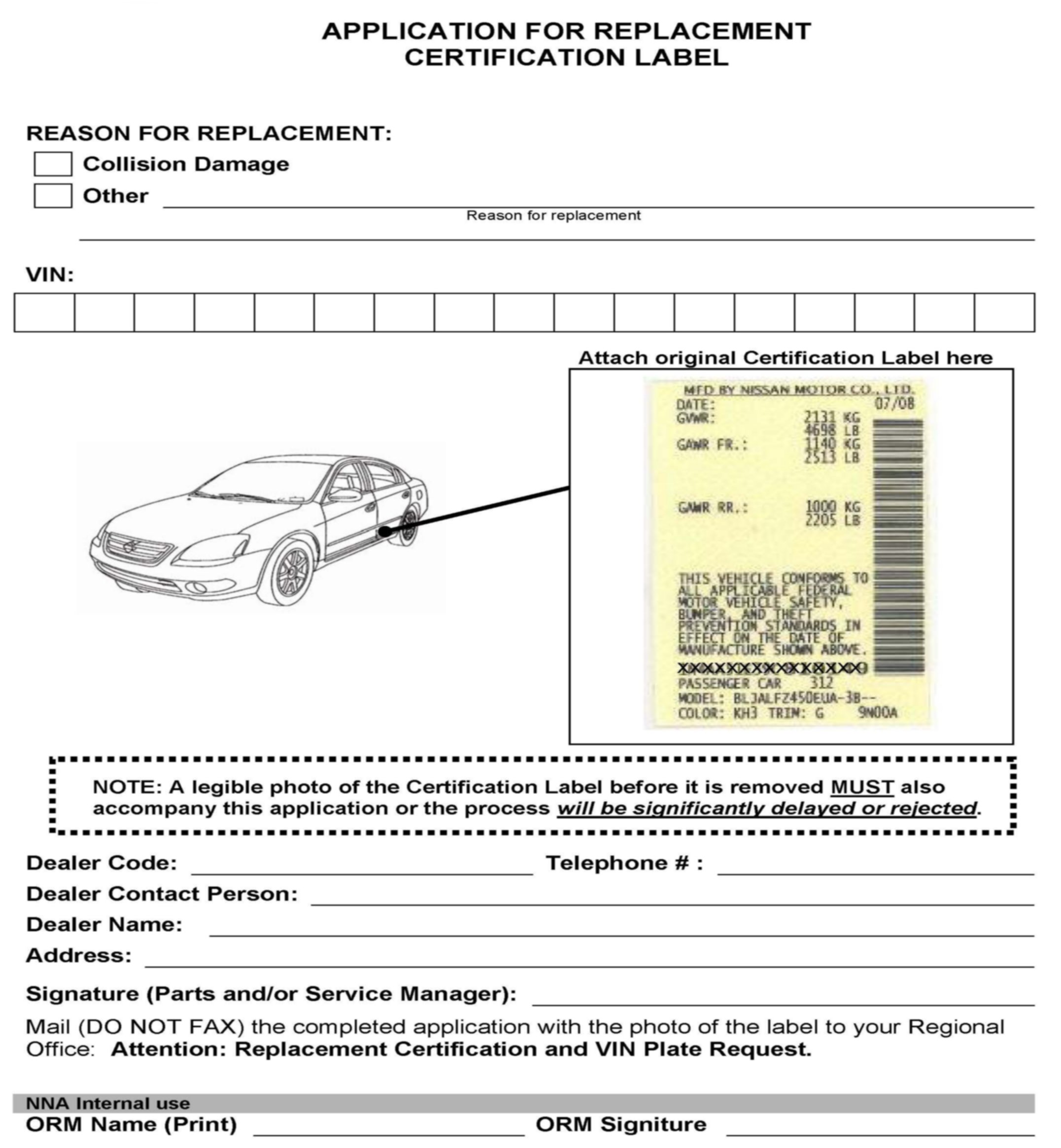 Because of collision damage or other vehicle repair, a replacement "Certification Label or "VIN Plate/Label" may be needed.