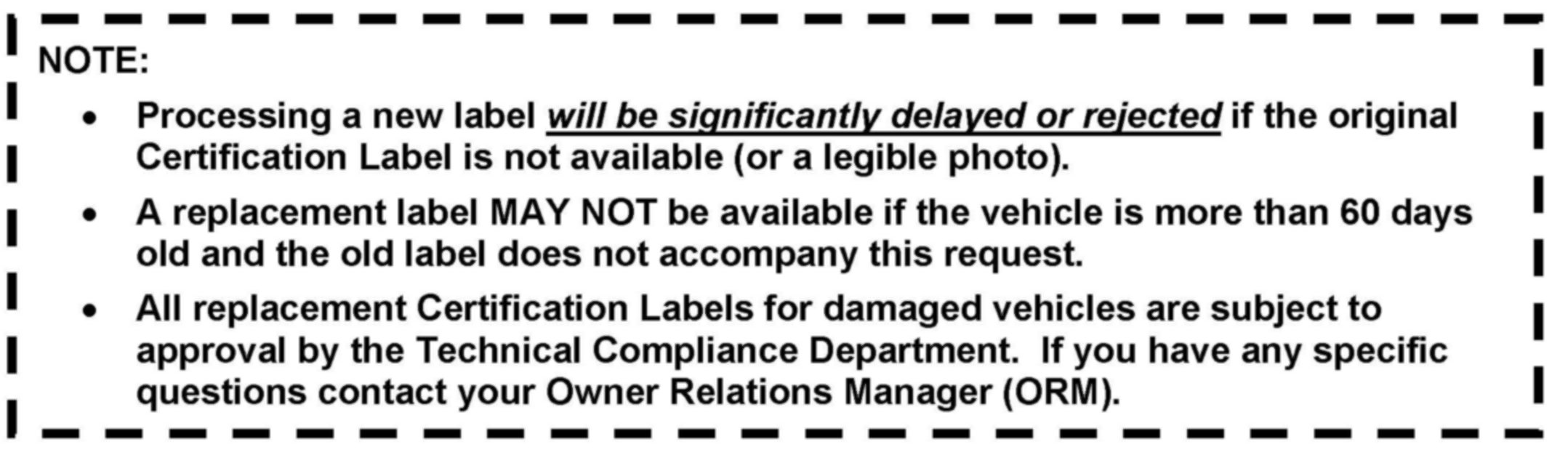 A replacement Certification Label may be requested ONLY if the vehicle is in a collision and: