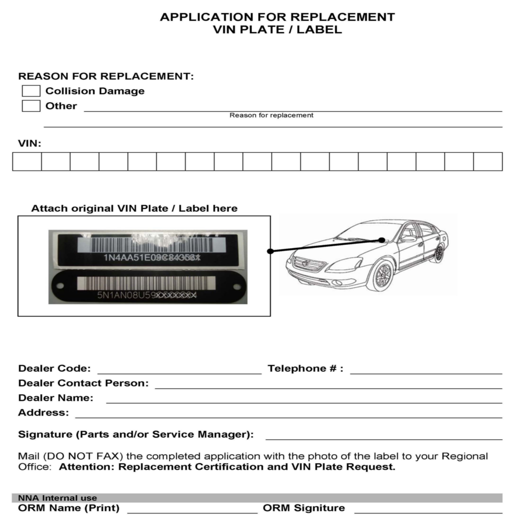 APPLICATION FOR REPLACEMENT VIN PLATE/LABEL