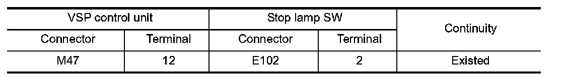 3.Check continuity between VSP control unit harness connector and stop lamp switch harness connector.