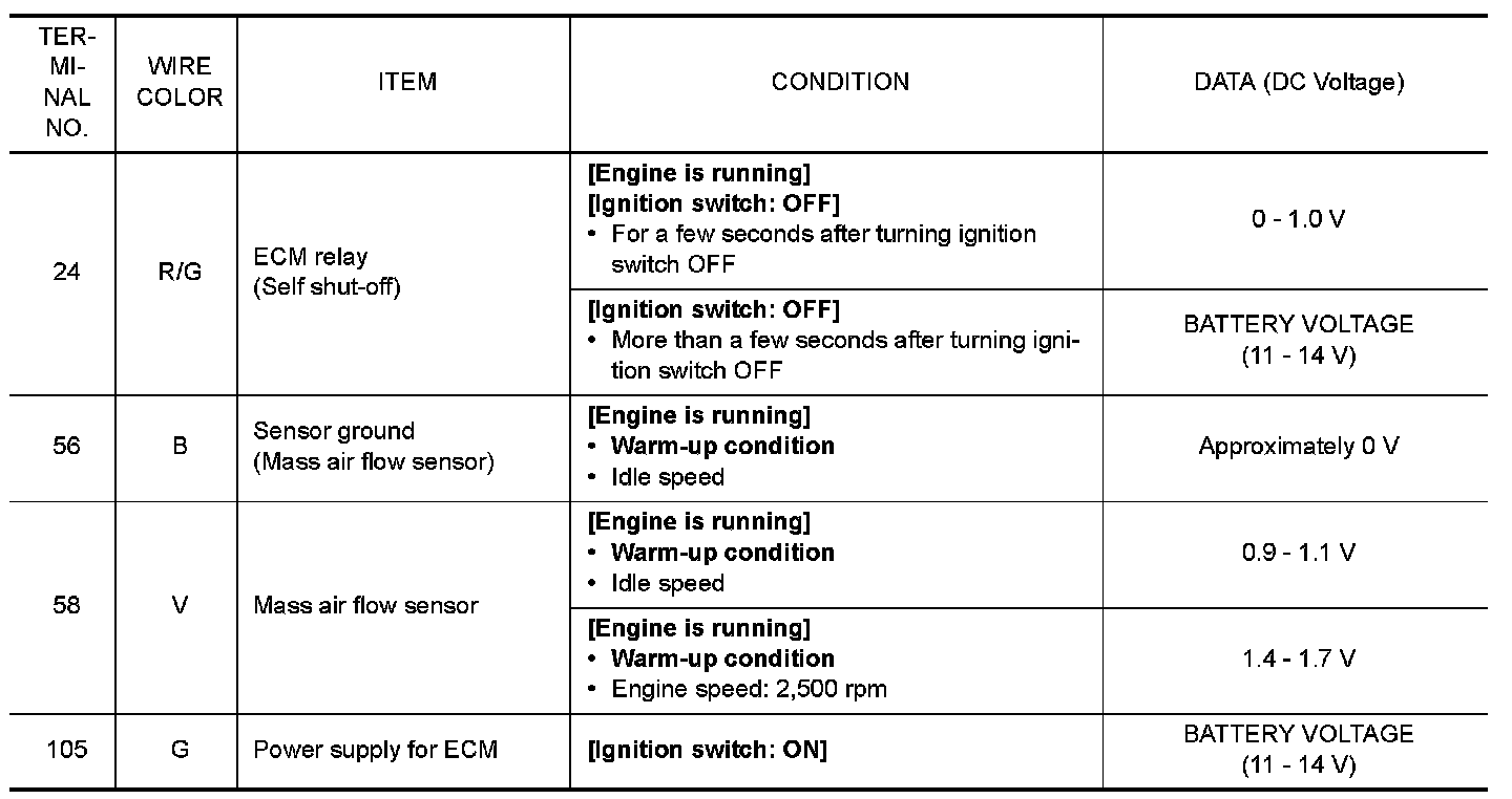 Never use ECM ground terminals when measuring input/output voltage. Doing so may result in damage to the ECM's transistor. Use a ground other than ECM terminals, such as the ground.