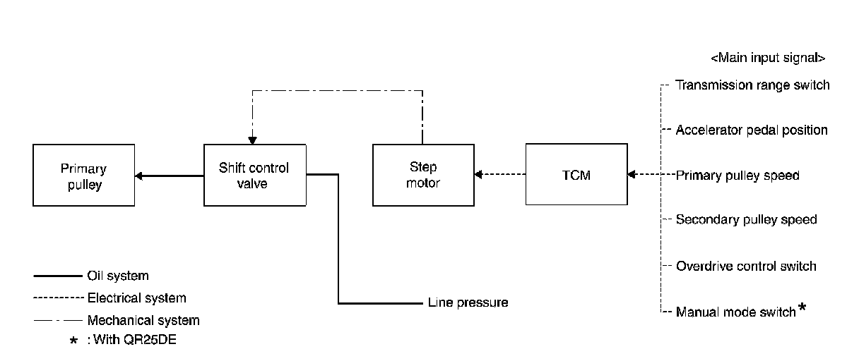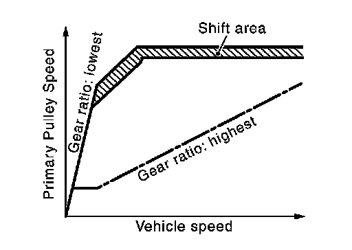 In order to select the gear ratio which can obtain the driving force in accordance with driver's intention and the vehicle condition, TCM monitors the driving conditions, such as the vehicle speed and the throttle position and selects the optimum gear ratio, and determines the gear change steps to the gear ratio. Then send the command to the step motor, and control the flow-in/flow-out of line pressure from the primary pulley to determine the position of the moving-pulley and control the gear ratio.