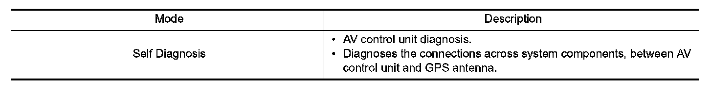 - The self-diagnosis mode performs diagnoses on the AV control unit, connections between system components as well as connections between AV control unit and GPS antenna. Then it displays the diagnosis results on the display.