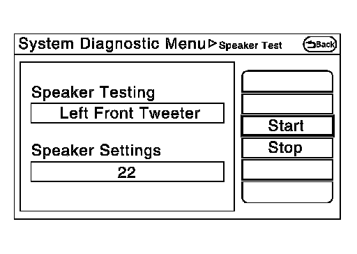 Select "SPEAKER DIAGNOSIS" to display the Speaker Diagnosis screen. Press "Start" to generate a test tone in a speaker. Press