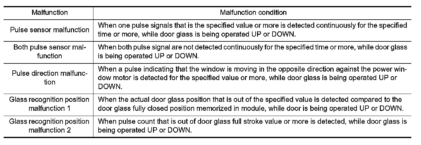 Switches to fail-safe control when malfunction is detected in encoder signal that detects up/down speed and direction of door glass. Switches to fail-safe control when a signal that is out of the specified value is detected between the fully closed position and the actual position of the glass.