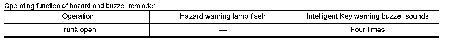 - When trunk is opened with request switch or remote controller button operation, the hazard lamps flash and the Intelligent Key warning buzzer or horns sound (hazard and buzzer/horn reminder function).