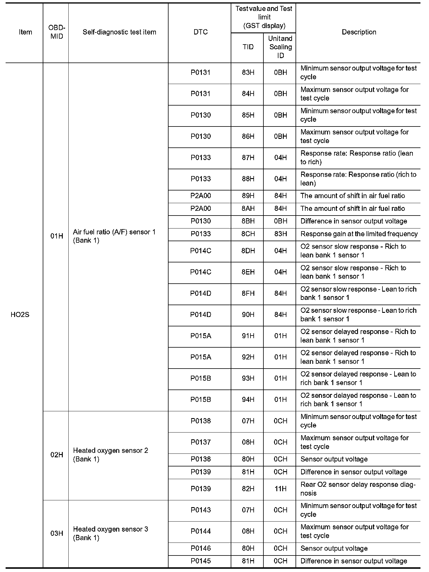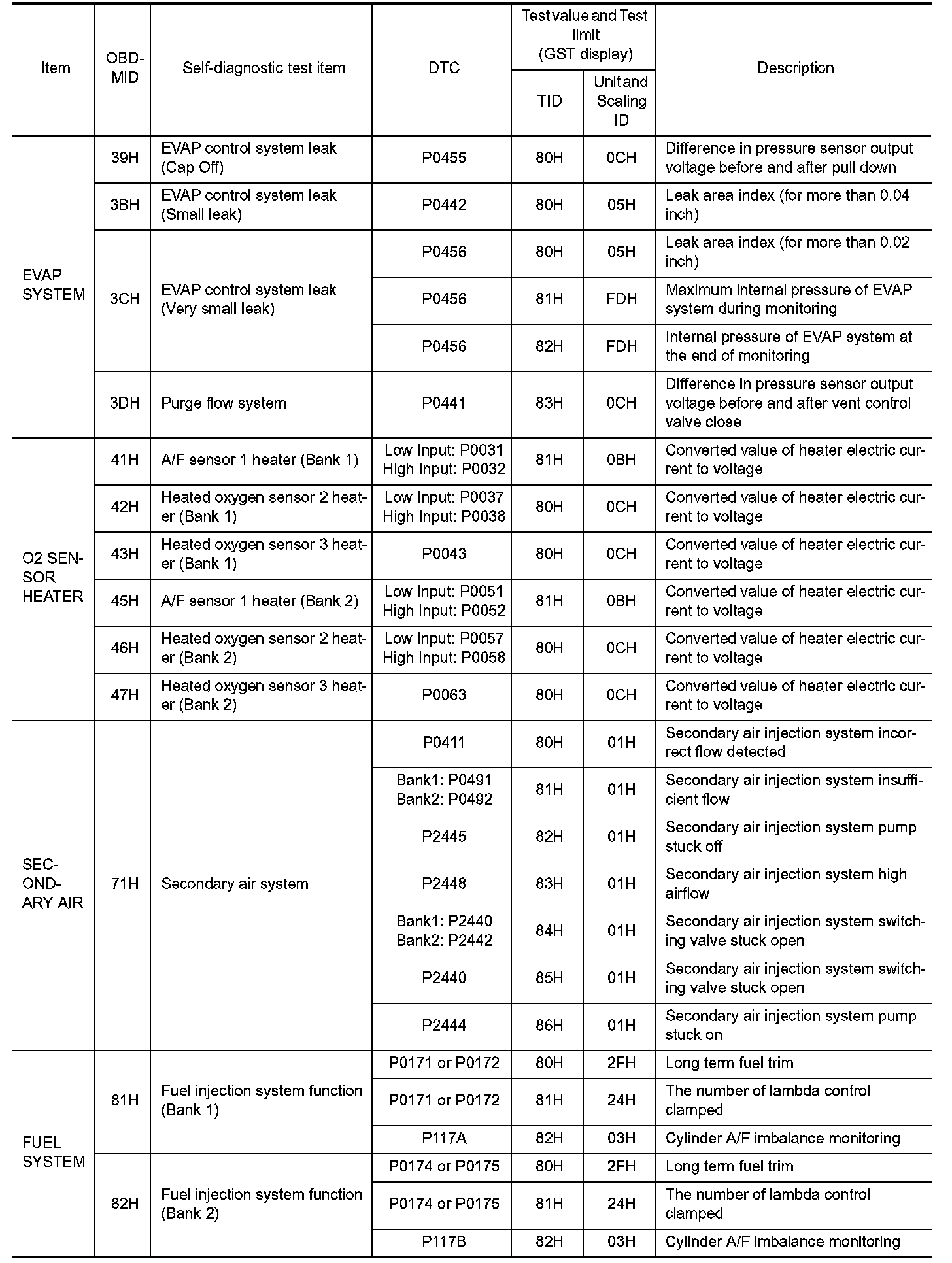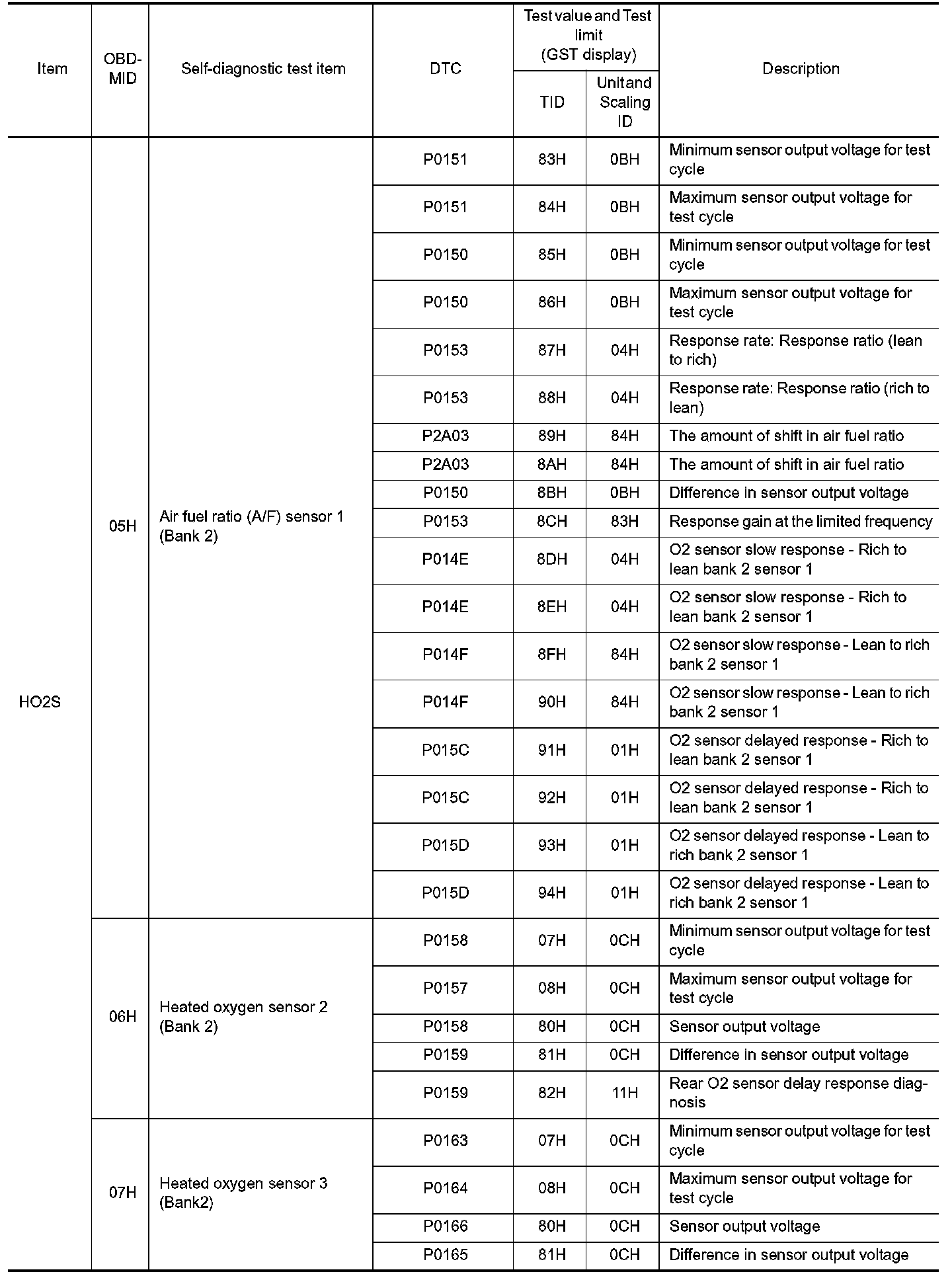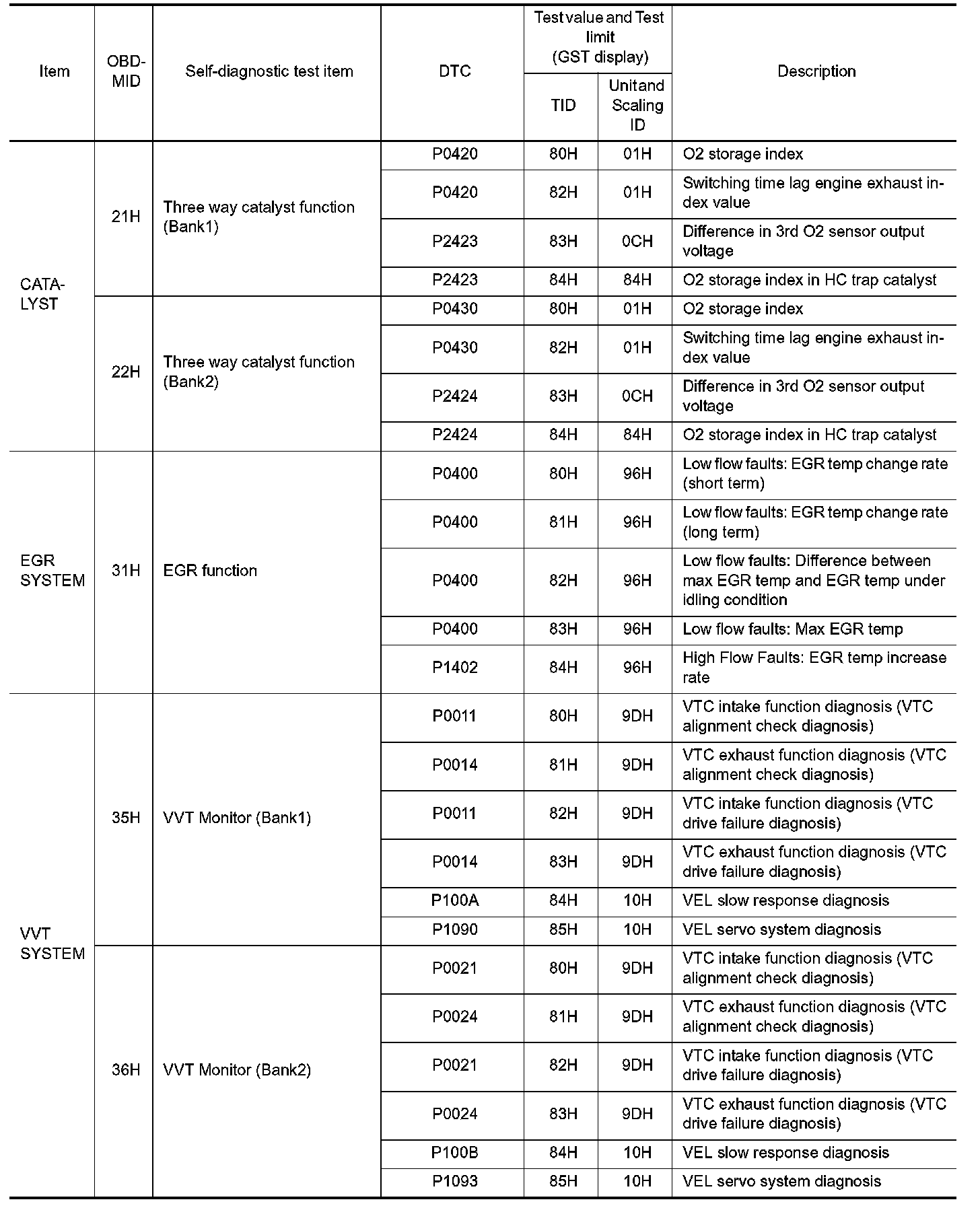 The items of the test value and test limit will be displayed with GST screen which items are provided by the ECM. (e.g., if bank 2 is not applied on this vehicle, only the items of bank 1 are displayed)
