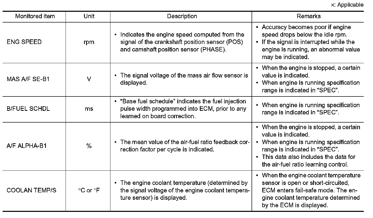 Any monitored item that does not match the vehicle being diagnosed is deleted from the display automatically.