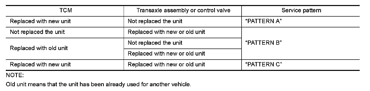 Perform the applicable service according to the following table when replacing TCM, transaxle assembly, or control valve.