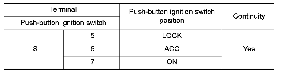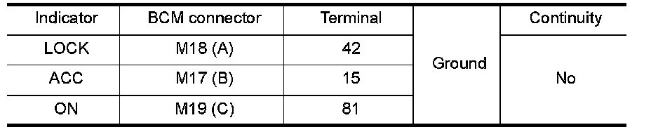 1.Check push-button ignition switch ("LOCK INDICATOR","ACC INDICATOR" and "IGNITION ON IND") in