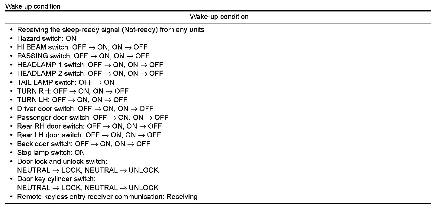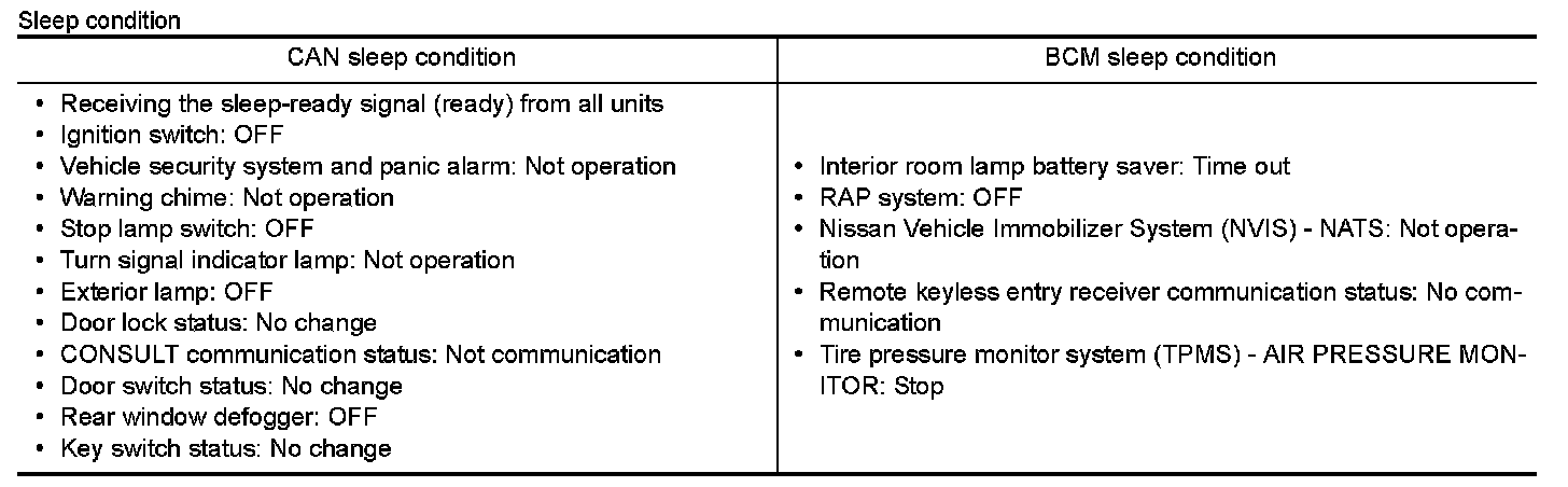 - BCM transmits the sleep wake up signal (sleep) to each unit when all of the CAN sleep conditions are fulfilled.