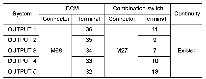 3.Check continuity between BCM harness connector and combination switch harness connector.