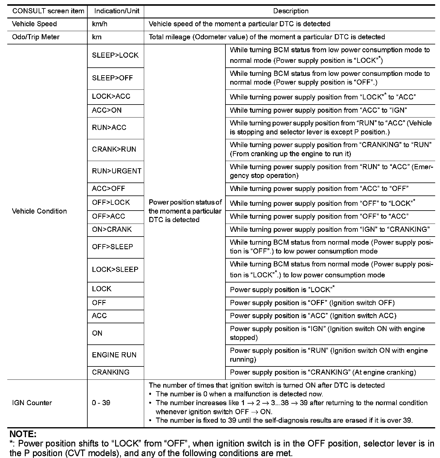 *: Power position shifts to "LOCK" from "OFF", when ignition switch is in the OFF position, selector lever is in the P position (CVT models), and any of the following conditions are met.
