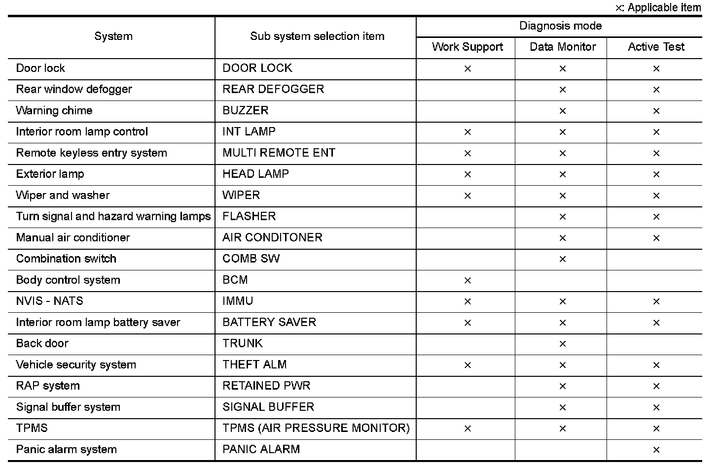It can perform the diagnosis modes except the following for all sub system selection items.
