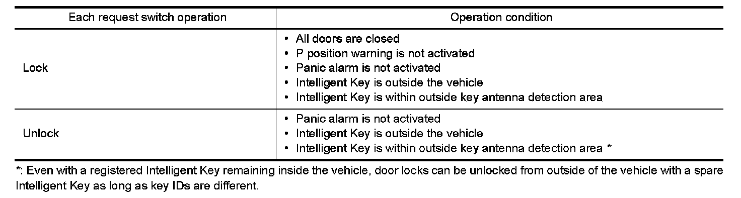 If the following conditions are satisfied, door lock/unlock operation is performed if the door request switch is operated.