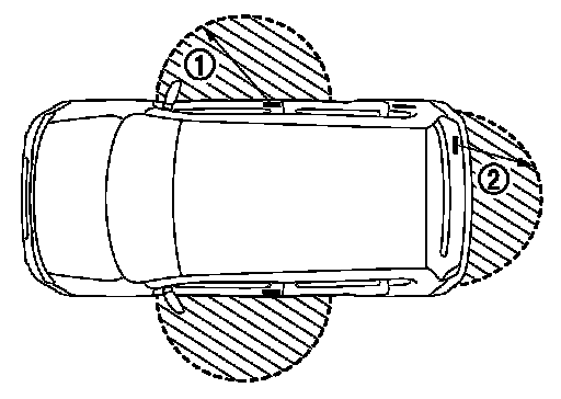 The outside key antenna detection area of door lock/unlock function is in the range of approximately 80 cm (31.50 in) surrounding the driver, passenger door handles (1) and back door handle (2). However, this operating range depends on the ambient conditions.