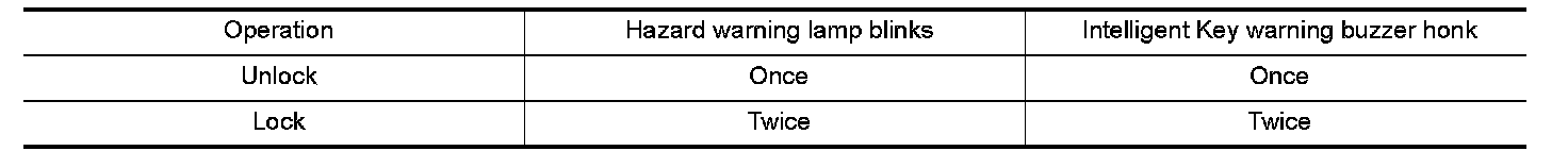 During lock, unlock, operation by each door request switch, the hazard warning lamps and Intelligent Key warning buzzer will blink or honk as a reminder.