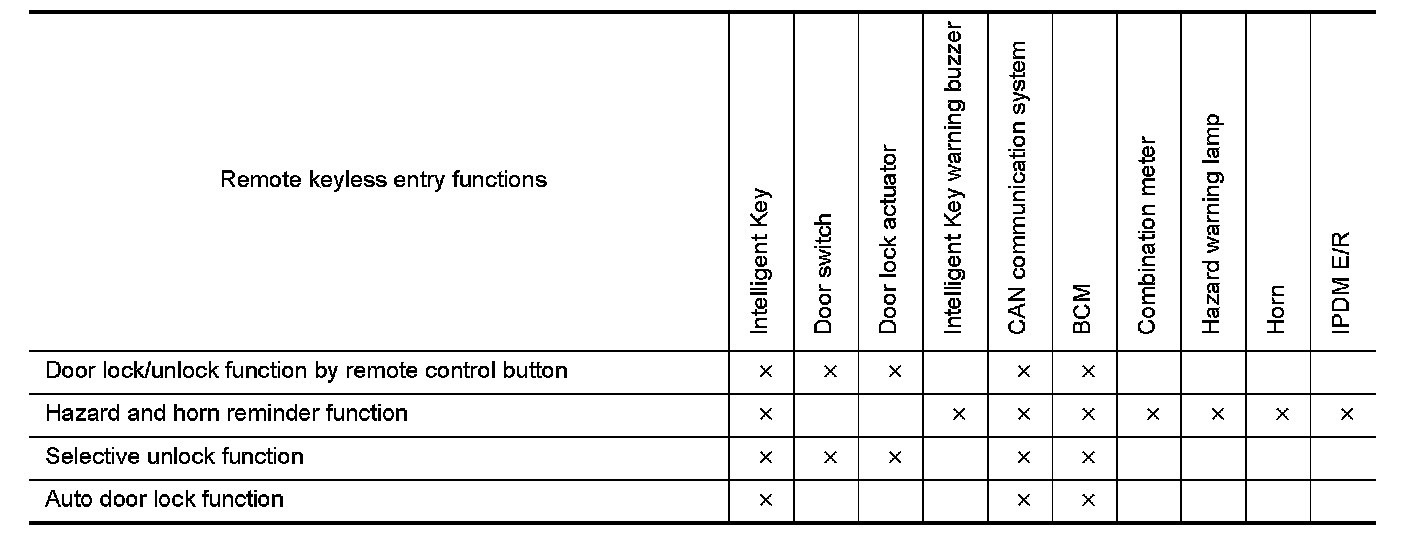 - When BCM receives the door lock/unlock signal, it operates all door lock actuators and the hazard lamp (lock: 2 times, unlock: 1 time) and horn chirp signal to IPDM E/R at the same time as a reminder.