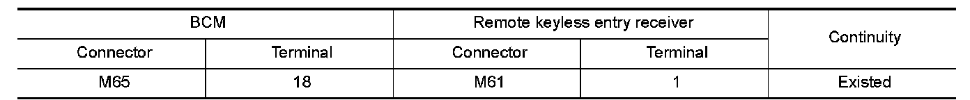 2.Check continuity between BCM harness connector and remote keyless entry receiver harness connector.