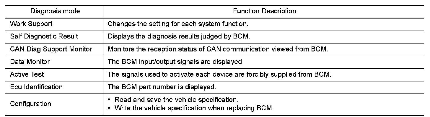 DIAGNOSIS SYSTEM (BCM) (WITHOUT INTELLIGENT KEY SYSTEM)COMMON ITEM : CONSULT Function (BCM - COMMON ITEM) APPLICATION ITEM CONSULT performs the following functions via CAN communication with BCM.