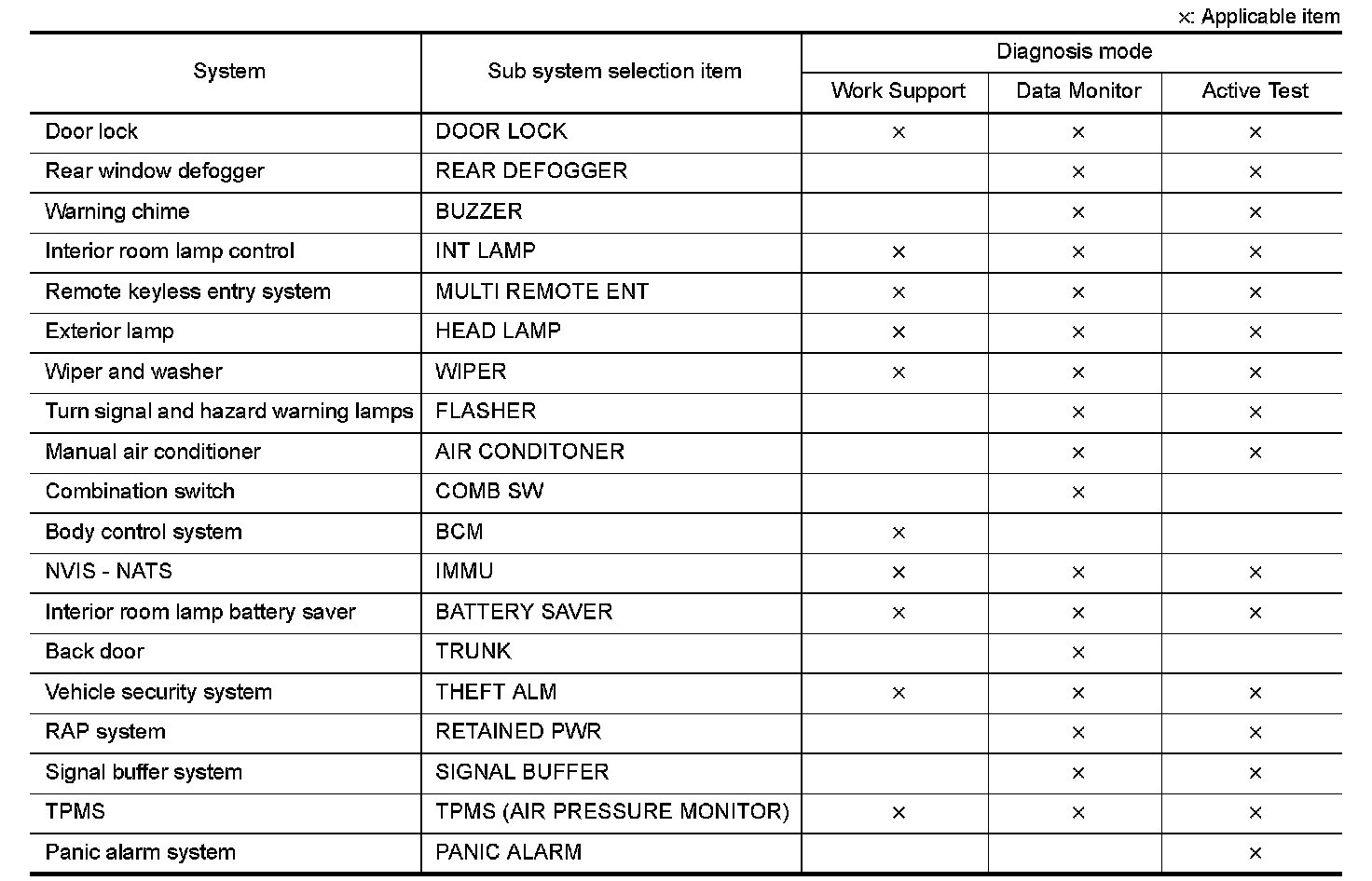 NOTE: It can perform the diagnosis modes except the following for all sub system selection items.
