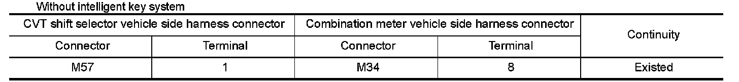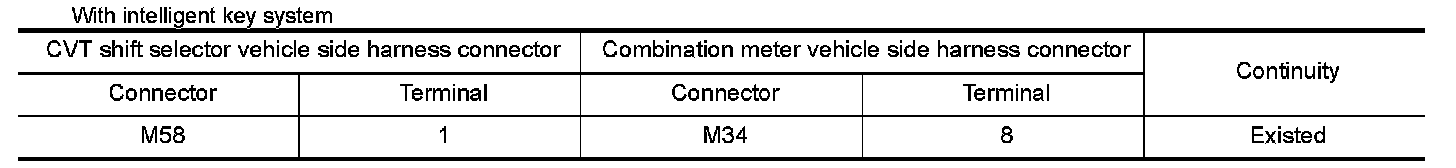 2.Check continuity between CVT shift selector vehicle side harness connector terminal and combination meter vehicle side harness connector terminal.