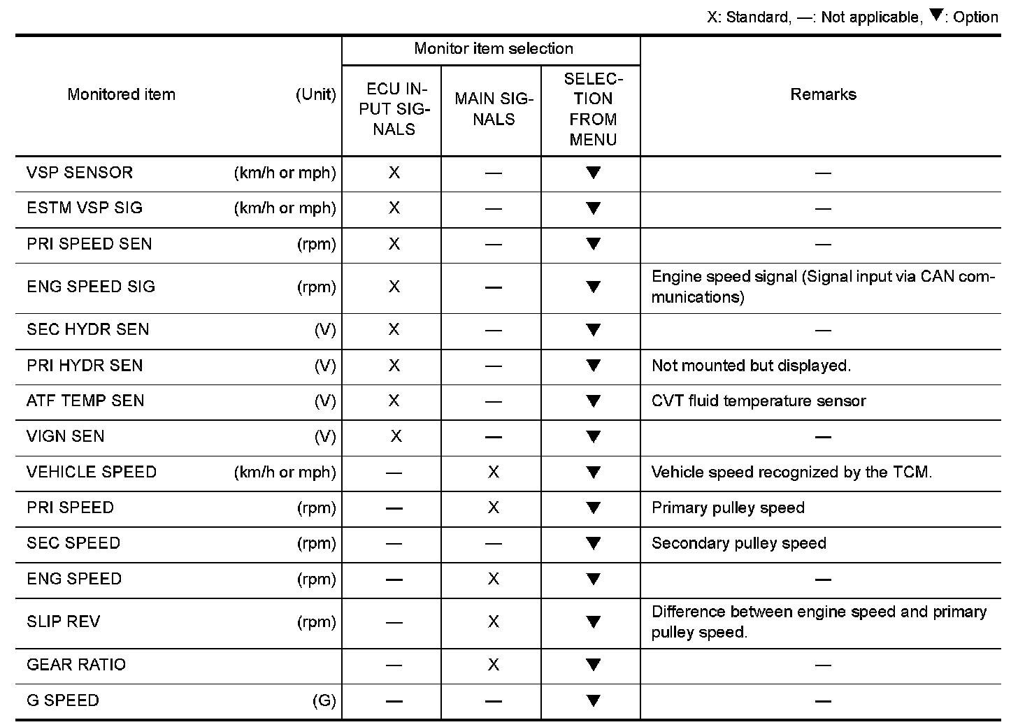 X: Standard, -: Not applicable, : Option