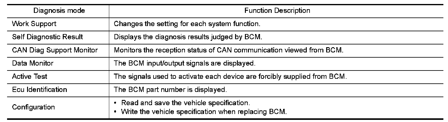 DIAGNOSIS SYSTEM (BCM) (WITHOUT INTELLIGENT KEY SYSTEM)COMMON ITEM : CONSULT Function (BCM - COMMON ITEM) APPLICATION ITEM CONSULT performs the following functions via CAN communication with BCM.
