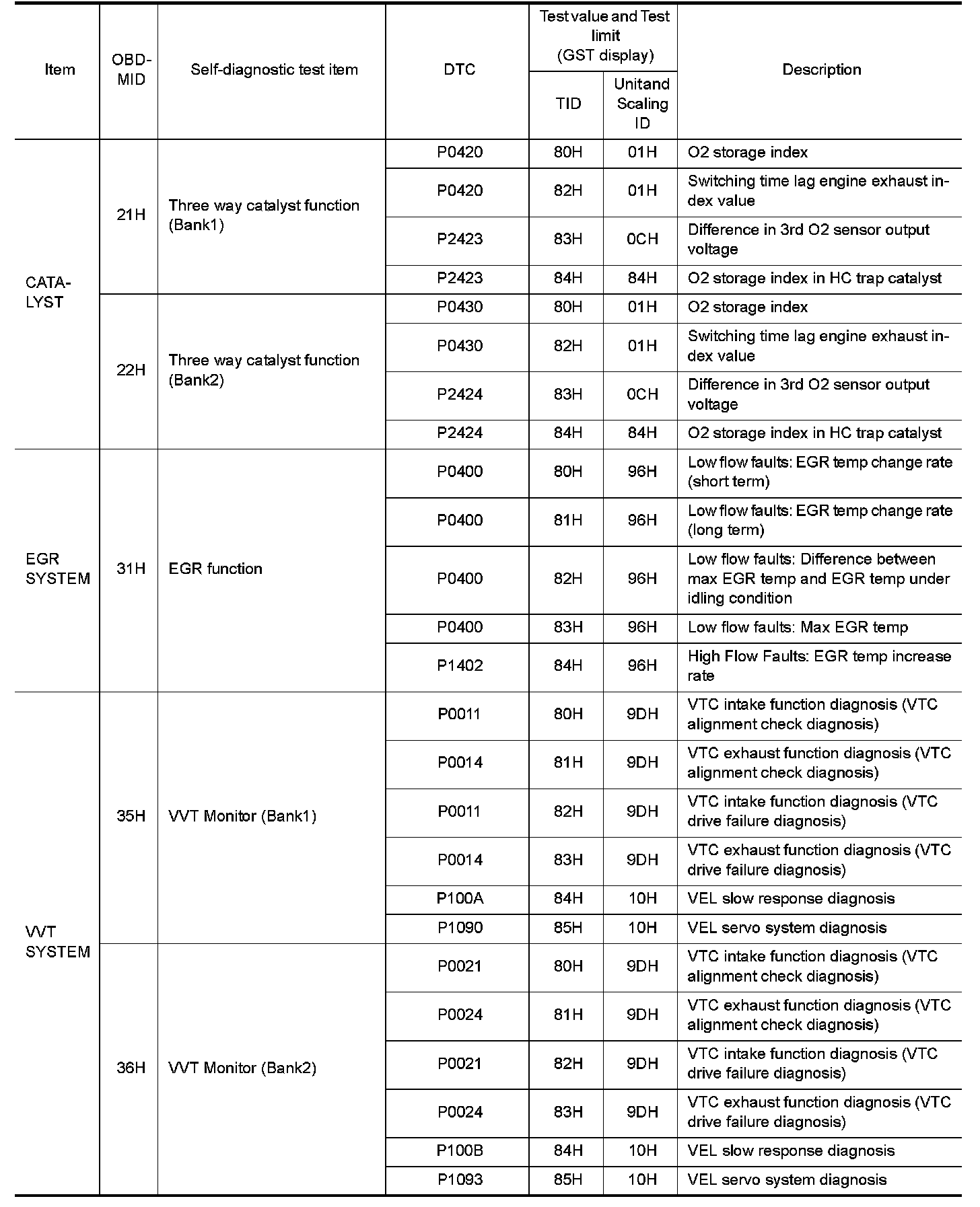 The test value is a parameter used to determine whether a system/circuit diagnostic test is OK or NG while being monitored by the ECM during self-diagnosis. The test limit is a reference value which is specified as the maximum or minimum value and is compared with the test value being monitored.