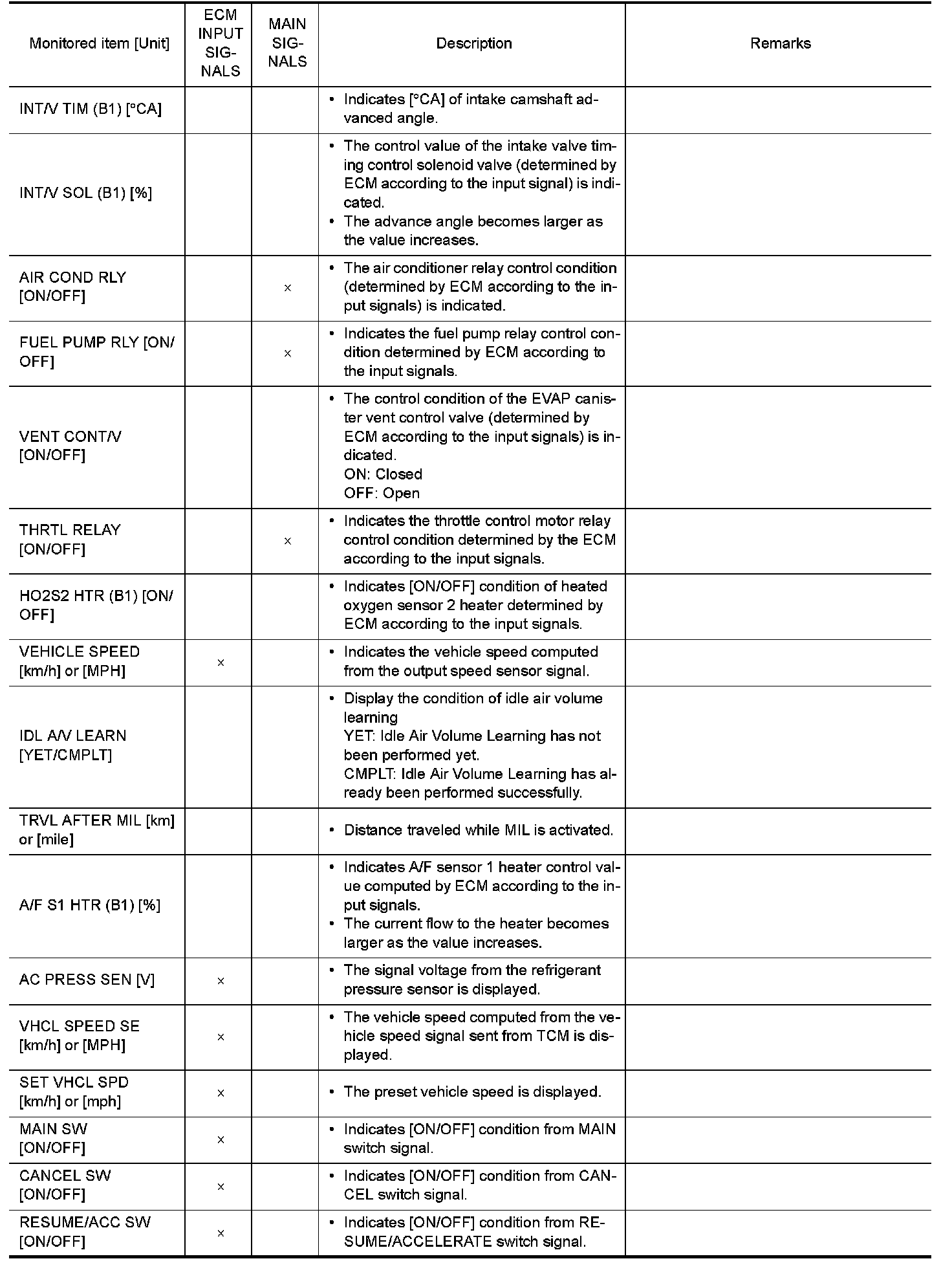 Any monitored item that does not match the vehicle being diagnosed is deleted from the display automatically.