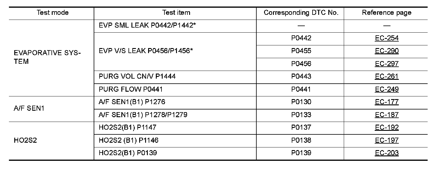 *: DTC P1442 and P1456 does not apply to D40 models but appears in DTC Work Support Mode screens.