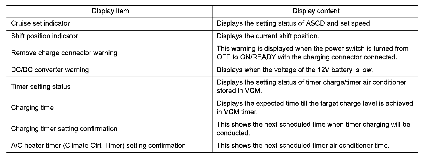 COMPONENT PARTSInformation Display Information necessary to control the information display is transmitted from each relevant control unit and entered into the combination meter. Based on this information, warning or other information appears on the information display. VCM displays the following items.