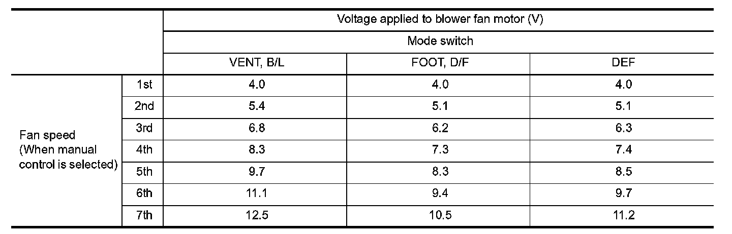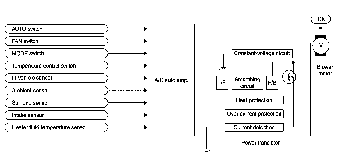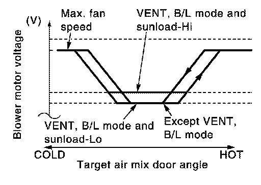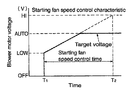 - A/C auto amp. changes voltage to power transistor gate and controls air flow in a continuous range (no steps) so that target air flow is achieved. At this time, the voltage applied to the blower fan motor is changed at the rate of 1.0 V per second in order to prevent any sudden changes in air flow.