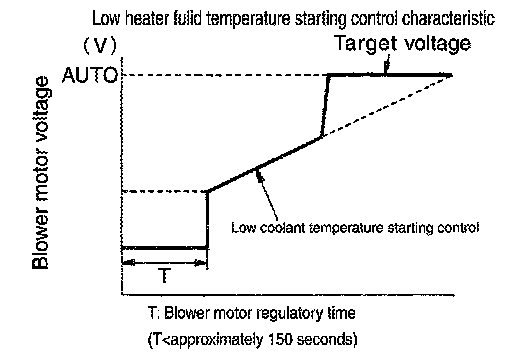 When blower fan motor starts, the A/C auto amp. suspends blower motor activation for a maximum of 150 seconds, according to the target air mix door position. This prevents cold air from being discharged. After this, voltage applied to power transistor gate is increased gradually, and the blower fan motor starts.