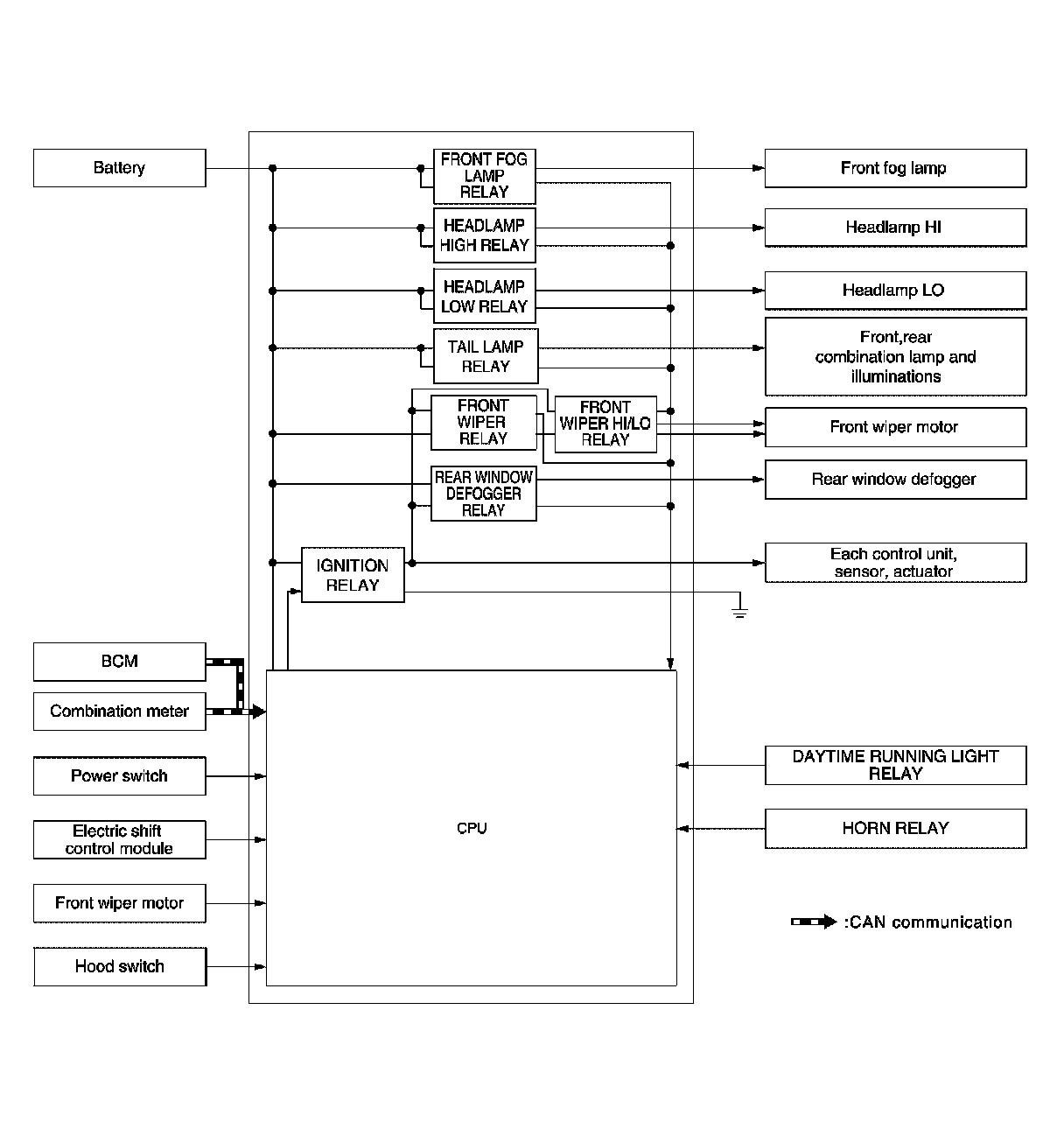 SYSTEMRELAY CONTROL SYSTEM : System Description SYSTEM DIAGRAM DESCRIPTION IPDM E/R activates the internal control circuit to perform the relay ON-OFF control according to the input signals from various sensors and the request signals received from control units via CAN communication.